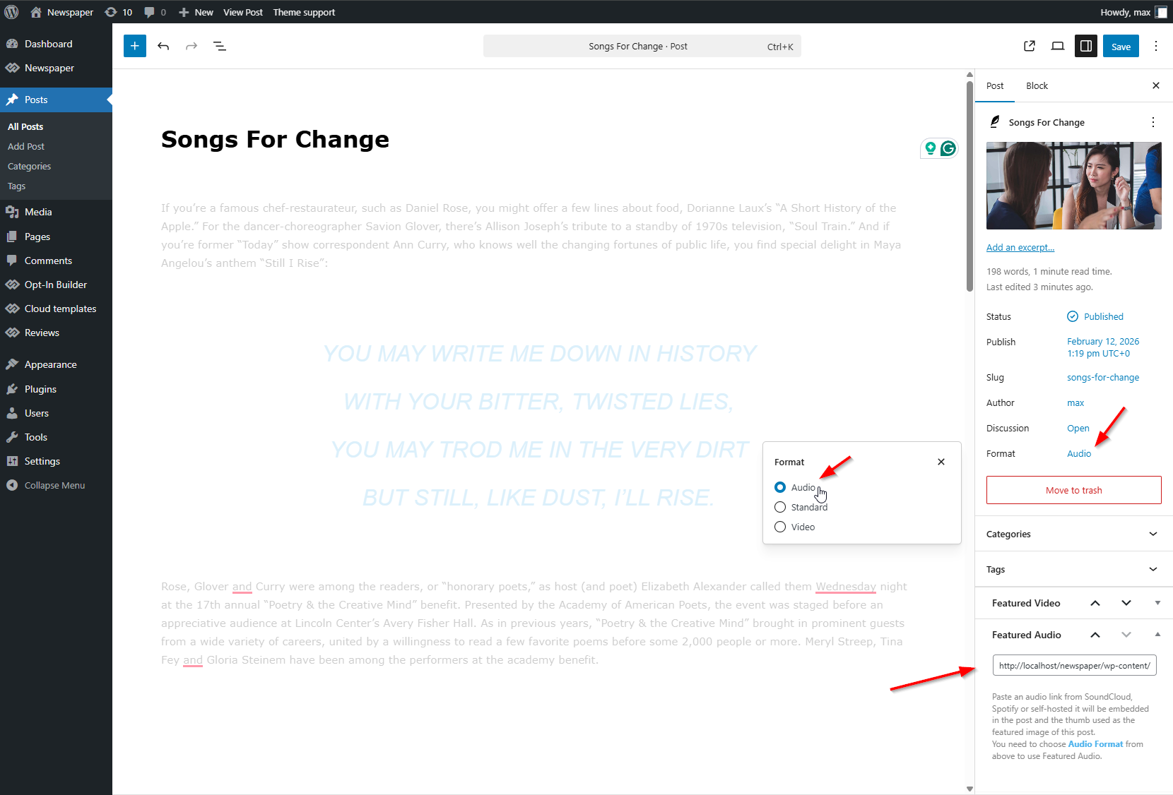 To set a Featured Audio for your post, paste an audio link from SoundCloud, Spotify or self-hosted it will be embedded in the post and the thumb used as the featured image of this post.
